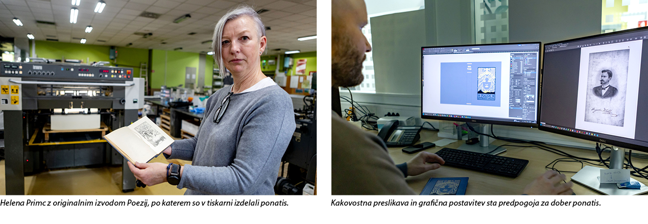 V tiskarno nas je povabila, ko je ponatis Kettejeve pesniške zbirke še nastajal. »V knjigi nismo ničesar postavili na novo, razen kolofona,« pojasni. Bralci bodo, enako kot naši predniki leta 1907, na platnici pod prsti čutili odtisnjeni kliše in občudovali zlatotisk v črnem okvirju. Pred njimi se bo nato odprla »Druga, pomnožena in pregledna izdaja.