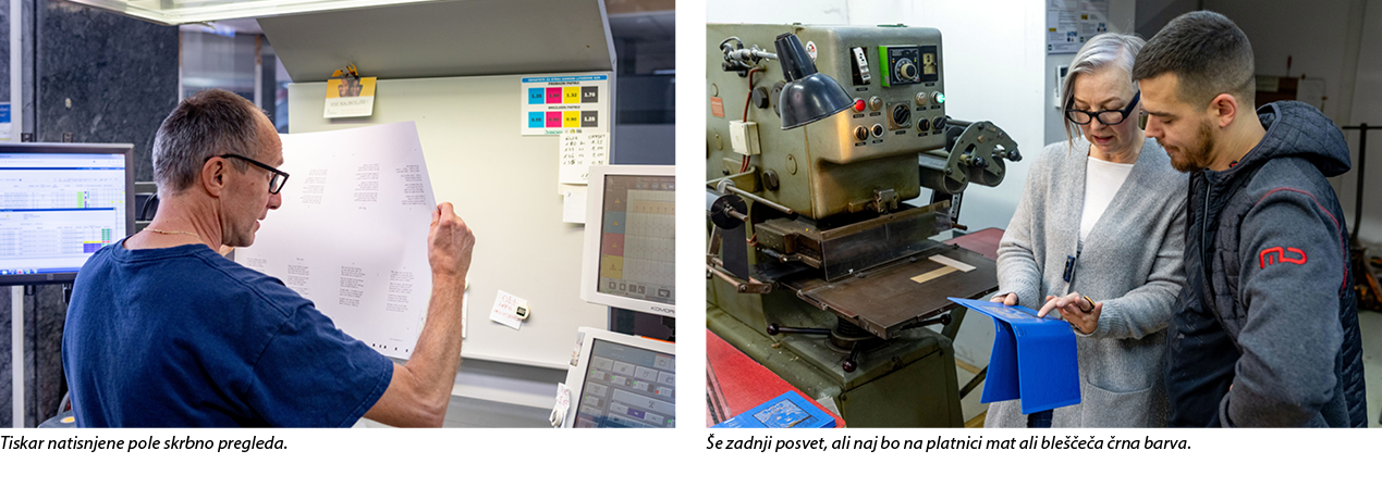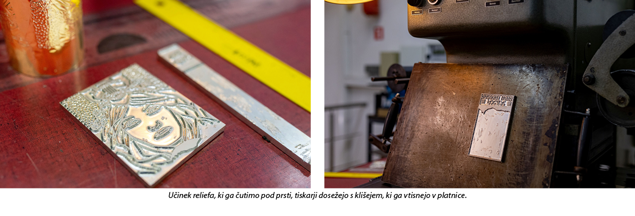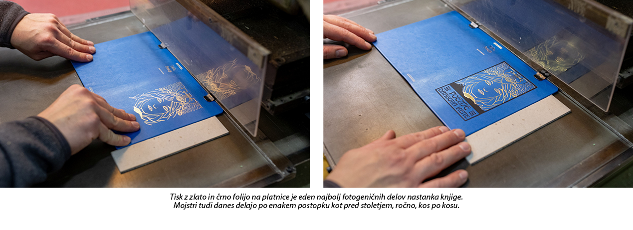 Za piko na i se čez nekaj dni vrnemo v Ljubljano, tokrat v hrupno delavnico na drugem koncu mesta, kjer so s pomočjo klišeja (kovinske ploščice z izdolbenim reliefom) v platnico odtisnili podobo, ki jo čutimo pod prsti na naslovni strani, in napis na zaobljenem hrbtišču knjige.